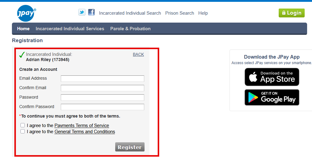 Once the app is installed or you are viewing JPAY.com you will create an account by searching for Adrian: